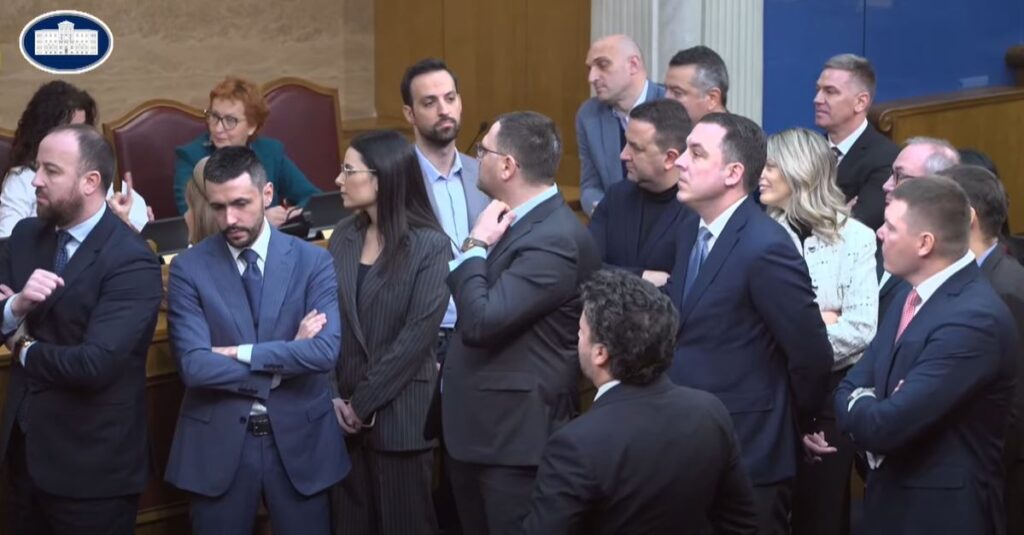 Poslanici vladajuće većine su napuštili salu, dok opozicija i dalje sjedi u plenarnoj sali.